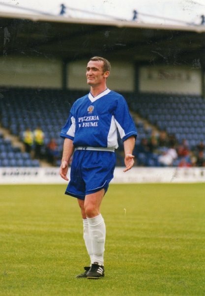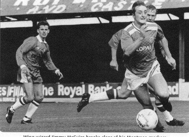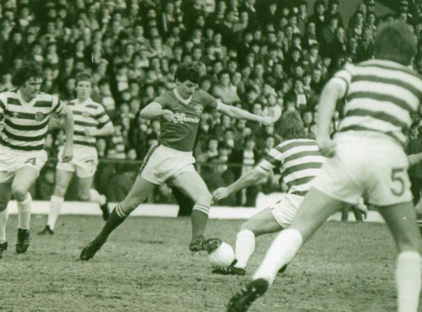 Jimmy Robertson at Celtic Park, with Roy Aitken and I reckon Murdo McLeod closing him down. Not sure of the Celts' 5 and 7. Jimmy McGuire in the classic Elopak kit. Also Stevie Malian and Jim Thomson (with hair). Also the run down Terregles Street terracing.