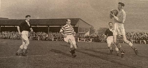 of Queens all - time top scorer big Jim Patterson in action versus Dundee in 1956. I can add to the caption that the Dee goalkeeper is Bill Brown who went on to play 28 times for Scotland mainly when he was at Spurs.