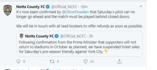 Following confirmation from the Prime Minister that supporters will not return to stadiums in October as planned, we have suspended ticket sales for Saturday’s pre-season friendly against York City.