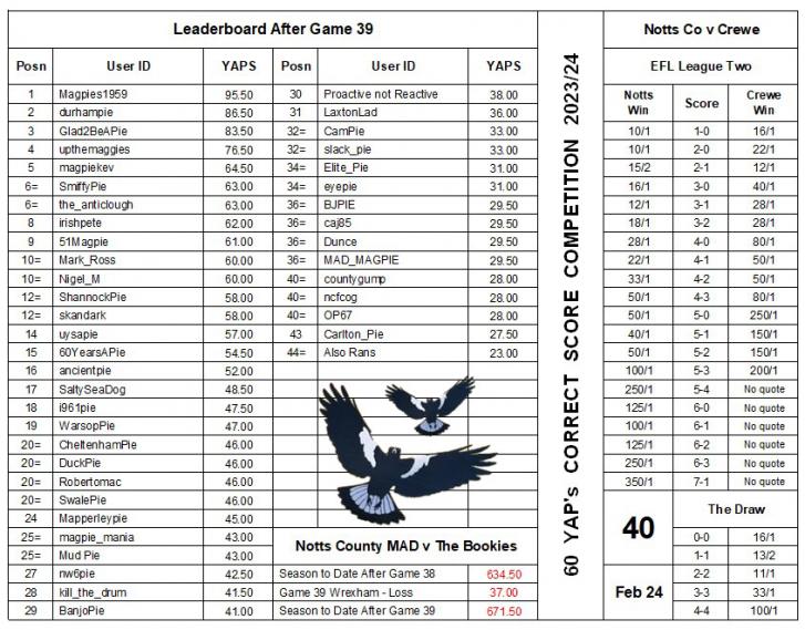 Only one correct prediction last Saturday sees Elite extricate himself (they can’t touch you for it) from the Also Rans. Notts will have to be on their game on Saturday as Crewe are unbeaten away this year, winning at Stockport, Barrow and Mansfield, and drawing at Tranmere.
