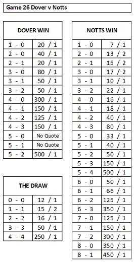 Here's what Bet365 think. Dover are 6/1 to win; Notts 2/5