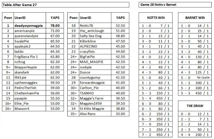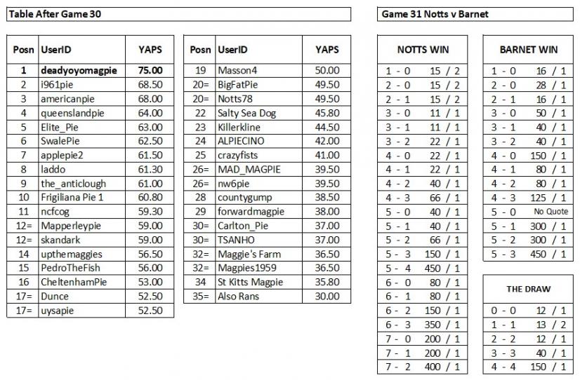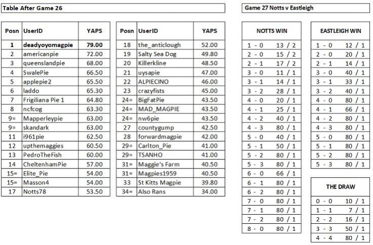 Three correctly forecast Notts would lose 2-1. It looks like EP has found his second wind and moves up to 5th. Will someone open a window please? After the defeat against Grimsby, two disappointed Yapettes, on checking the predictions, suggested that correct ones forecasting a Notts defeat should have the winnings deducted from their balance instead of them being added on. Although a novel idea, which would maybe see the ‘Also Rans’ off the bottom of the table at some stage, I pointed out that the rules didn’t say you couldn’t forecast an opposition win.