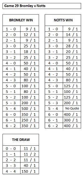 Here's the odds for the Bromley game. They are favourites at 31/20; Notts are 17/10; the draw is 9/4.