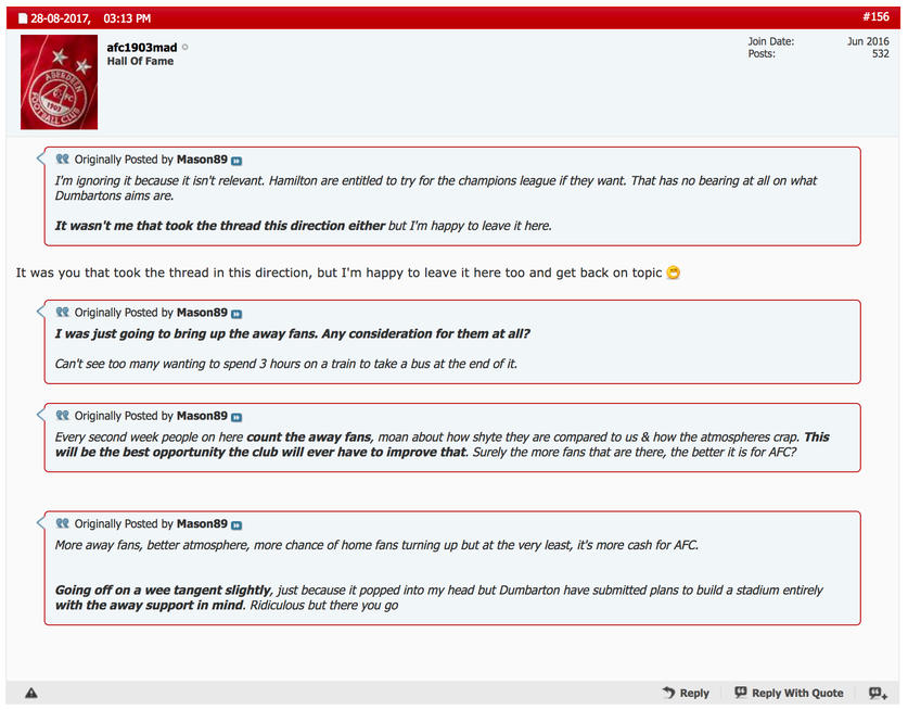 Discussing what's on offer for the away support at the new stadium, is not taking a new stadium thread off topic. It was only when the other two tried to showcase their expert knowledge of Dumbarton FC that it went that way.