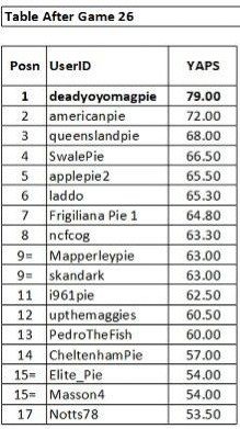I thought I was going to be the Chesterfield of the yaps table. I haven't had anything right for months. Hopefully I can hold on now. Think 1 or 2 more for the win, barring no-one turning into Mystic Meg!