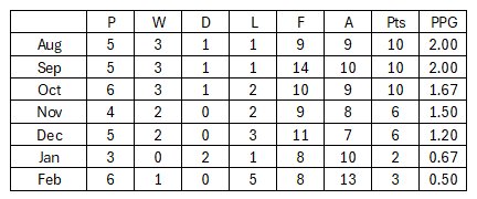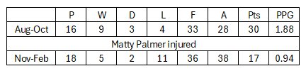 Since we thumped Morecambe 5-0, there's been a middle-order batting collapse, just 5 points from an available 27 - W1 D2 L6