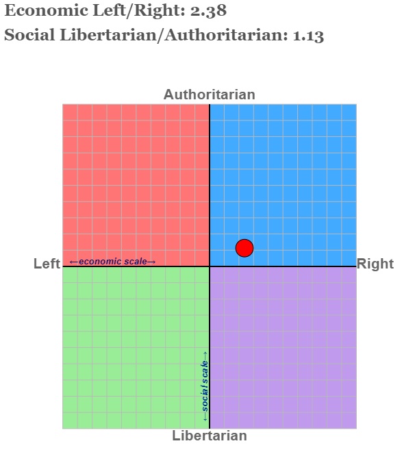 Interesting, I took the test and to my surprise came very close to the centre but slightly north-west in the pink box. That apparently makes me a mild leftist authoritarian. I would however have liked a 'neither agree or disagree' box because some answers were very borderline.