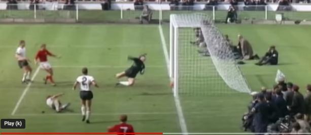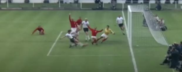 This discussion has been had before and many disagreed. I have finally found footage that seems to show he was. A good 2 yards offside. The shot has just been struck, the German player at the far post is offside under the Offside Law of the time.