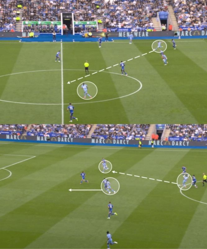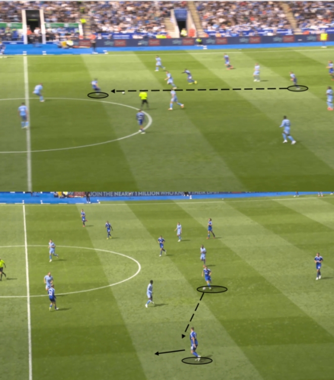 2.This move also drew pressure into central areas, "creating space out wide"👍which was intentional from Leicester as they would often draw Coventry inside before playing out to the flanks, just like you see in the image above.