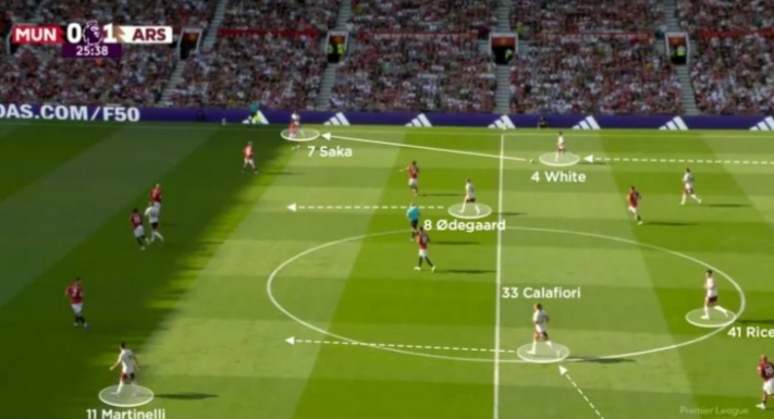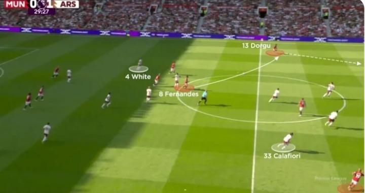 For example it appears Arsenal used a 4-3-3 shape with the ball with their centre-backs split to build around the Man U front 3 with Odegaard making their wide runs which helped the Arse to build around inside the spaces between the advancing Scum full-backs, so Arsenal then had access straight into Viktor Gyokeres.
