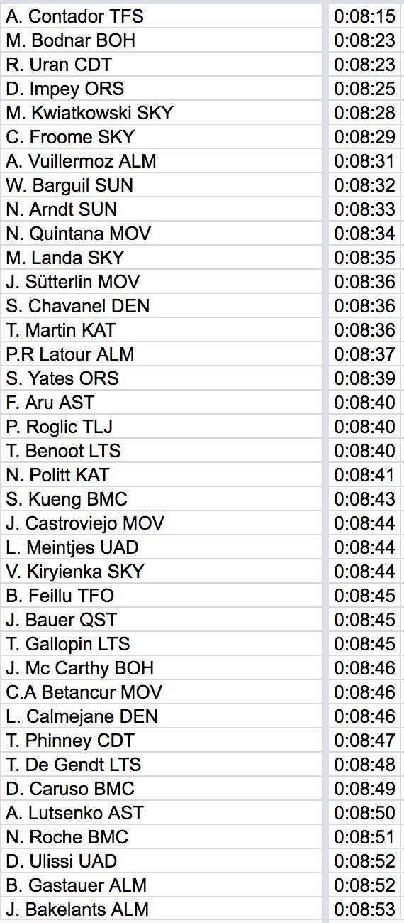 A super ride from Contador - only 21s off Bodnar and fastest in the middle (climb) section by 8 seconds !