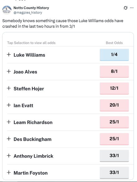 I also dont think it will be Williams. He has burnt his bridges with Notts, and there is no second chance.. I do think that Alves will remain as assistant head coach..